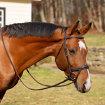 The Equinavia Valkyrie Alternative Flash Bridle offers a fresh approach to traditional flash bridles. Crafted from premium leather in brown with ivory stitching or all black, this bridle features individually positioned straps that minimize pressure on the nosebridge. A padded chin pad behind the crank-style noseband helps alleviate pressure, while the noseband design prevents uneven tightening. The simple raised padded browband and stainless steel hardware with hook stud closures enhance both style and functionality. Flexi rubber reins are included for superior grip and performance.